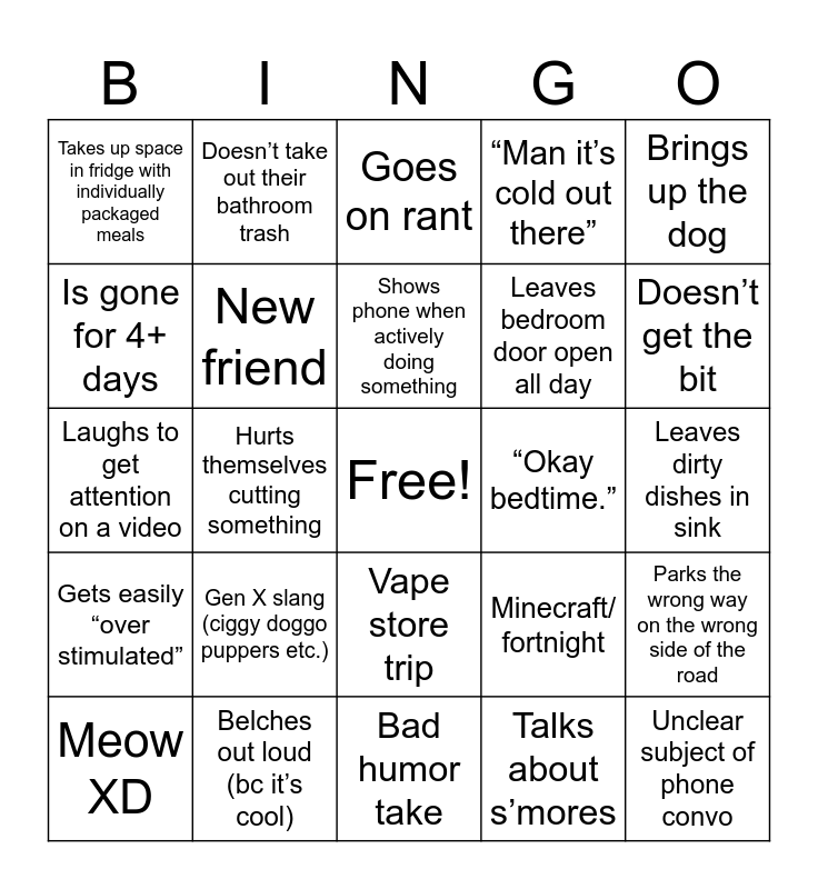 This bingo card has a free space and 24 words: Meow XD, Gen X slang (ciggy doggo puppers etc.), Shows phone when actively doing something, Talks about s’mores, Brings up the dog, Takes up space in fridge with individually packaged meals, Doesn’t take out their bathroom trash, Goes on rant, “Okay bedtime.”, Leaves dirty dishes in sink, Laughs to get attention on a video, New friend, Minecraft/ fortnight, Parks the wrong way on the wrong side of the road, Is gone for 4+ days, Belches out loud (bc it’s cool), Bad humor take, “Man it’s cold out there”, Doesn’t get the bit, Gets easily “over stimulated”, Hurts themselves cutting something, Vape store trip, Leaves bedroom door open all day and Unclear subject of phone convo.
