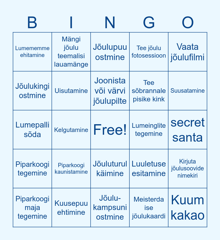 This bingo card has a free space and 29 words: Piparkoogi maja tegemine, Piparkoogi söömine, Kelgutamine, Loed ühe jõuluraamatu, Lumememme ehitamine, Jõulupuu ostmine, Uisutamine, Piparkoogi kaunistamine, Lumeinglite tegemine, Kuusepuu ehtimine, secret santa, Kuum kakao, Jõulu- kampsuni ostmine, Meisterda ise jõulukaardi, Suusatamine, päkapiku kommi saamine, Jõuluturul käimine, Piparkoogi tegemine, Vaata jõulufilmi, Lumepalli sõda, Luuletuse esitamine, Lumehelbe tegemine paberist, Tee sõbrannale pisike kink, Jõulukingi ostmine, Tee jõulu fotosessioon, Mängi jõulu teemalisi lauamänge, Kirjuta jõulusoovide nimekiri, Joonista või värvi jõulupilte and Osta advendikalender.