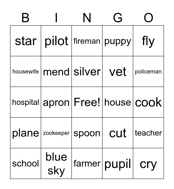 This bingo card has a free space and 28 words: teacher, doctor, vet, pupil, housewife, fireman, pilot, plane, house, school, hospital, puppy, blue sky, farmer, policeman, postman, zookeeper, mend, silver, spoon, star, moon, cry, apron, cook, cut, fly and tree.