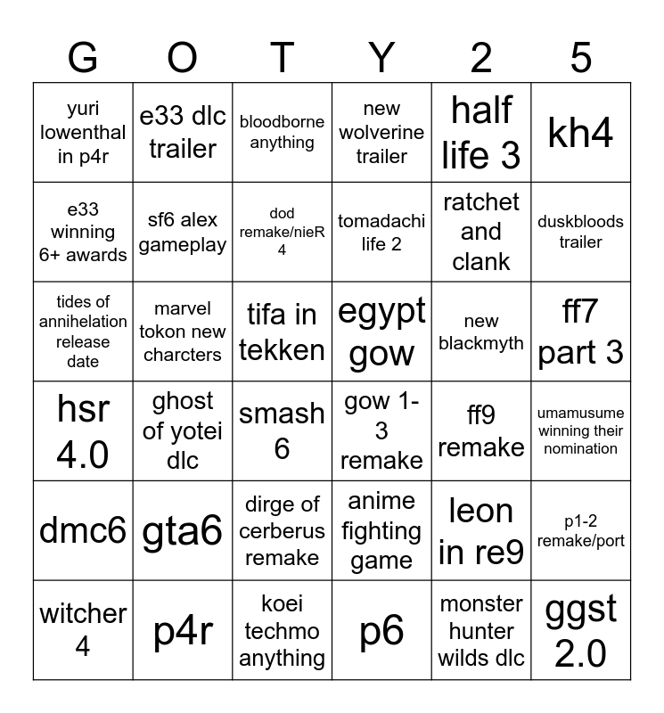 This bingo card has 39 words: p4r, witcher 4, smth Balatro, e33 winning 6+ awards, smash 6, ff7 part 3, sf6 alex gameplay, ggst 2.0, half life 3, egypt gow, duskbloods trailer, new wolverine trailer, tides of annihelation release date, tifa in tekken, marvel tokon new charcters, new blackmyth, leon in re9, yuri lowenthal in p4r, koei techmo anything, hsr 4.0, kh4, ff9 remake, dod remake/nieR 4, tomadachi life 2, p6, dirge of cerberus remake, dmc6, monster hunter wilds dlc, gta6, e33 dlc trailer, gow psp games, p1-2 remake/port, bloodborne anything, gow 1-3 remake, umamusume winning their nomination, anime fighting game, ghost of yotei dlc, ratchet and clank and p5au.