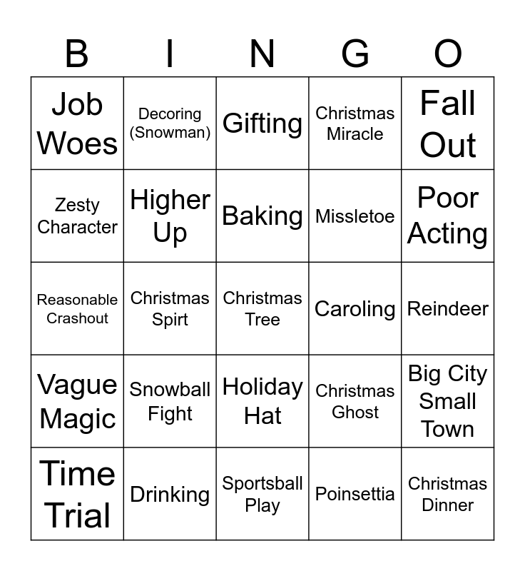 This bingo card has a free space and 33 words: Hot Coco/ ENog, Snow, Christmas Spirt, Family, Vague Magic, Higher Up, Fall Out, Time Trial, Decoring (Snowman), Santa, Baking, Gifting, Get together (Romantic), Horse Riding, Caroling, Poor Acting, Drinking, Reasonable Crashout, Snowball Fight, Christmas Ghost, Holiday Hat, Trade Up (Romantic), Job Woes, Reindeer, Sportsball Play, Christmas Dinner, Christmas Miracle, Missletoe, Zesty Character, Big City Small Town, Christmas Trauma Dump, Poinsettia and Christmas Town.