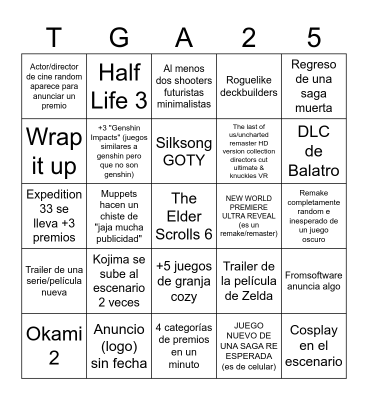 This bingo card has 25 words: Kojima se sube al escenario 2 veces, 4 categorías de premios en un minuto, Silksong GOTY, Okami 2, Regreso de una saga muerta, Actor/director de cine random aparece para anunciar un premio, Wrap it up, Half Life 3, NEW WORLD PREMIERE ULTRA REVEAL (es un remake/remaster), +5 juegos de granja cozy, The last of us/uncharted remaster HD version collection directors cut ultimate & knuckles VR, Expedition 33 se lleva +3 premios, Trailer de la película de Zelda, Fromsoftware anuncia algo, +3 "Genshin Impacts" (juegos similares a genshin pero que no son genshin), Cosplay en el escenario, Remake completamente random e inesperado de un juego oscuro, Al menos dos shooters futuristas minimalistas, DLC de Balatro, Muppets hacen un chiste de "jaja mucha publicidad", The Elder Scrolls 6, Anuncio (logo) sin fecha, Trailer de una serie/película nueva, Roguelike deckbuilders and JUEGO NUEVO DE UNA SAGA RE ESPERADA (es de celular).