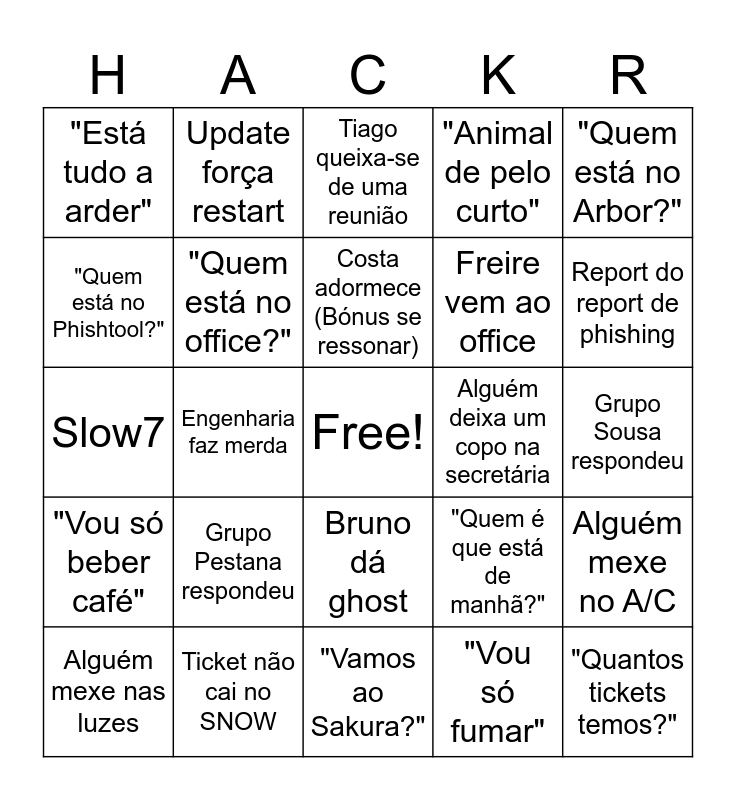 This bingo card has a free space and 59 words: Marchão fala de THM, Ticket não cai no SNOW, "Devia enviar email?", "Vou só beber café", "Vou só fumar", "Como querem fazer com o almoço?", "Quem está no office?", "Quem está remote?", Freire vem ao office, Joana foi para o SIRESP, "Animal de pelo curto", "Sou um Friendly Hacker", "Quem está no Phishtool?", "Quem está no ANY.RUN?", "Faz a passagem de turno", "Está tudo a arder", "Quantos tickets temos?", "Quem está no Arbor?", Reunião semanal é adiada, Costa adormece (Bónus se ressonar), Alguém deixa um copo na secretária, Tiago queixa-se de uma reunião, Alguém mexe nas luzes, Alguém mexe no A/C, Bruno avisa de ataque (Bónus se projeto), Marchão está à espera da query, "Wassup Beijing", Engenharia manda ticket (Bónus se falso positivo), Report do report de phishing, Publicidade = Phishing, Red faz pentest, Cliente é estúpido, DDoS verdadeiro, Updates da Microsoft, Update força restart, Campanha de phishing nova, "Comunicado anteriormente ao cliente", Engenharia faz merda, "Mitra reviews MITRE", Slow7, Marchão critica ex-N2, Grupo Pestana respondeu, Grupo Sousa respondeu, Media Capital responde aos tickets, NOS faz forward para o BNIE, Chamam ao Vitor de "Bruno", "Isto é uma merda", Roast ao THM, Bruno dá ghost, "Vamos ao Sakura?", "Bora ao Smashville?", Cliente em projeto, Momento zucalandês, "Está a funcionar" (Bónus se não estiver), Queixas da escala, "Quem é que está de manhã?", "Quem é que está de tarde?", "Quem é que está de noite?" and Engenharia empurra com a barriga.