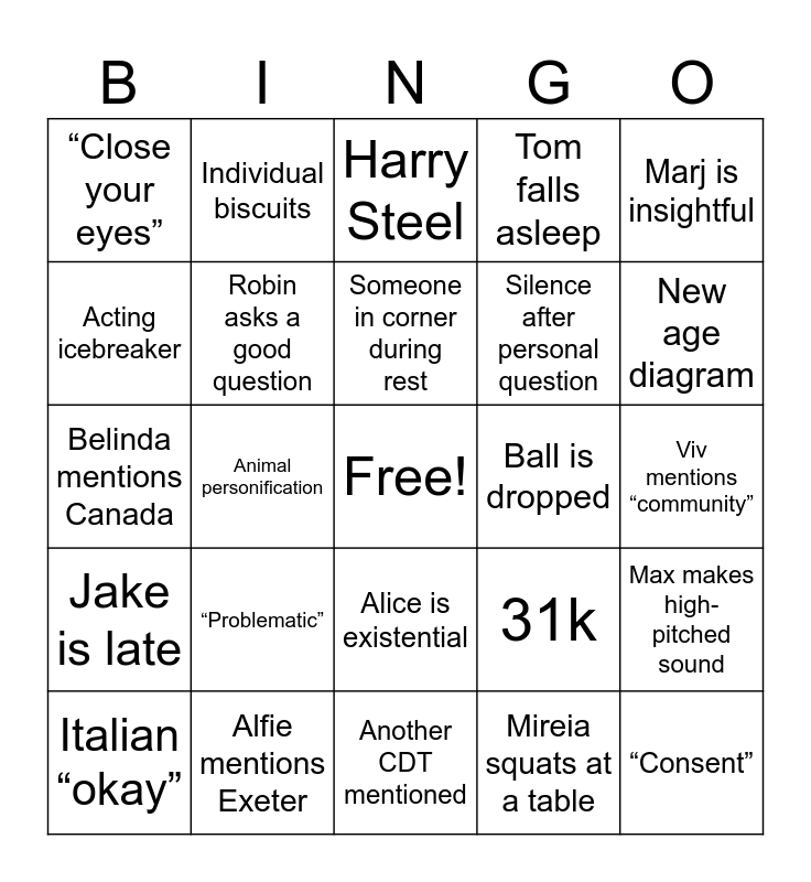 This bingo card has a free space and 24 words: “Problematic”, Alfie mentions Exeter, Someone in corner during rest, Italian “okay”, Marj is insightful, “Close your eyes”, Acting icebreaker, Individual biscuits, Ball is dropped, Alice is existential, Silence after personal question, Belinda mentions Canada, 31k, Max makes high-pitched sound, Robin asks a good question, Mireia squats at a table, Viv mentions “community”, Harry Steel, New age diagram, Animal personification, “Consent”, Jake is late, Tom falls asleep and Another CDT mentioned.