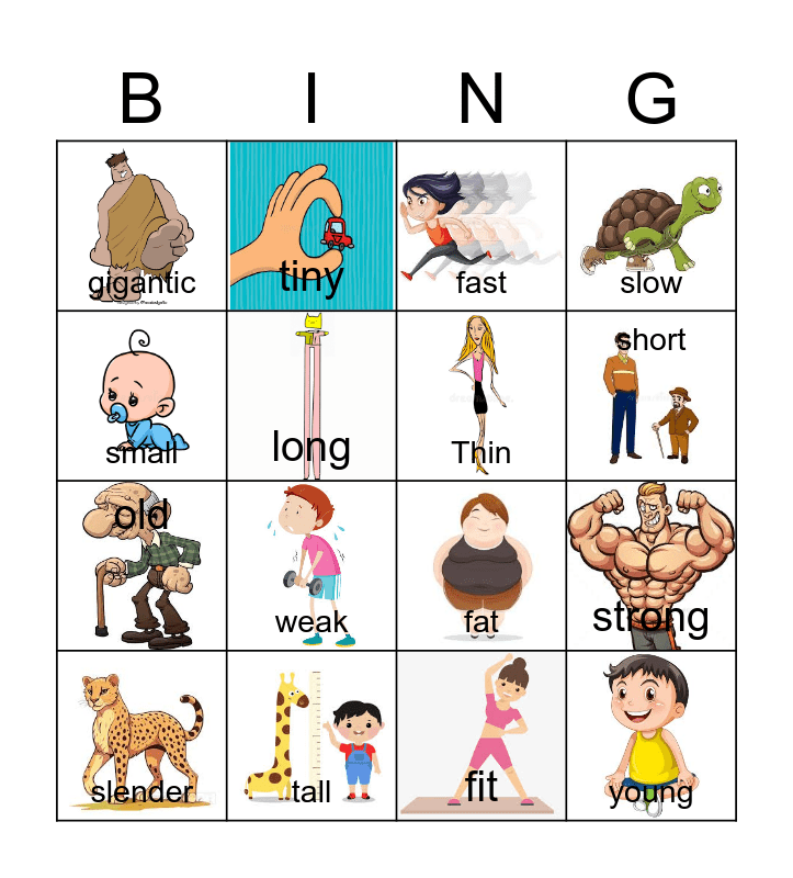 This bingo card has 16 images and 16 words: tall, strong, fast, gigantic, old, tiny, fat, fit, small, long, slender, slow, weak, short, Thin and young.