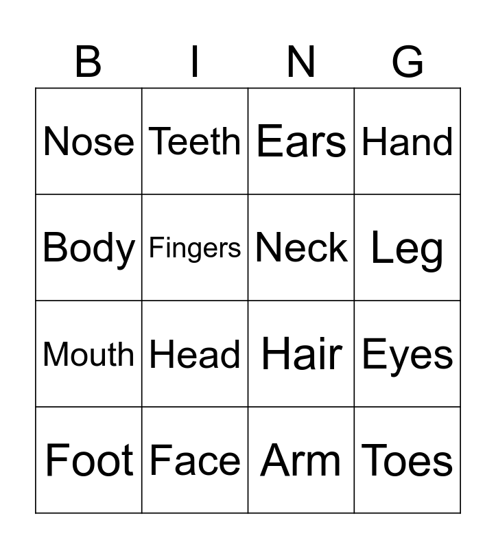 This bingo card has 16 words: Face, Eyes, Ears, Nose, Mouth, Teeth, Hair, Arm, Body, Fingers, Foot, Hand, Head, Leg, Neck and Toes.