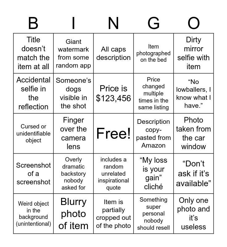 This bingo card has a free space and 29 words: Weird object in the background (unintentional), Item surrounded by trash/clutter, Finger over the camera lens, “Pick up only — I don’t deliver. Ever.”, Title doesn’t match the item at all, All caps description, Someone’s dogs visible in the shot, Overly dramatic backstory nobody asked for, Description copy-pasted from Amazon, Blurry photo of item, Photo taken from the car window, Only one photo and it’s useless, Item is partially cropped out of the photo, Something super personal nobody should resell, “No lowballers, I know what I have.”, “Don’t know what this is” listing, includes a random unrelated inspirational quote, Screenshot of a screenshot, Dirty mirror selfie with item, Cursed or unidentifiable object, “My loss is your gain” cliché, Listed as $1 but real price is in description, Price changed multiple times in the same listing, Accidental selfie in the reflection, Item photographed on the bed, Giant watermark from some random app, “Don’t ask if it’s available”, Price is $123,456 and “Firm” on a hilariously bad price.