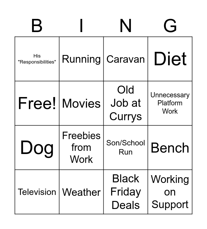 This bingo card has 16 words: Weather, Bench, Caravan, His "Responsibilities", Dog, Running, Son/School Run, Black Friday Deals, Free!, Movies, Television, Diet, Freebies from Work, Unnecessary Platform Work, Old Job at Currys and Working on Support.
