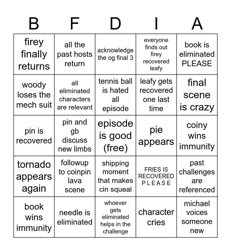 This bingo card has a free space and 24 words: followup to coinpin lava scene, needle is eliminated, tennis ball is hated all episode, book wins immunity, book is eliminated PLEASE, firey finally returns, woody loses the mech suit, all the past hosts return, pie appears, shipping moment that makes cin squeal, leafy gets recovered one last time, pin is recovered, FRIES IS RECOVERED P L E A S E, past challenges are referenced, all eliminated characters are relevant, character cries, coiny wins immunity, acknowledge the og final 3, final scene is crazy, pin and gb discuss new limbs, michael voices someone new, tornado appears again, everyone finds out firey recovered leafy and whoever gets eliminated helps in the challenge.