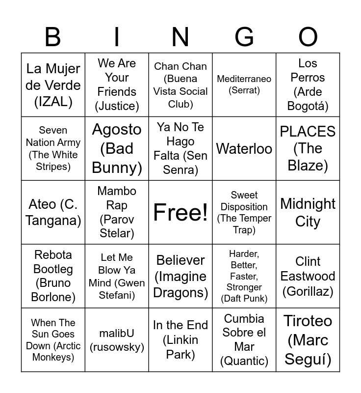 This bingo card has a free space and 58 words: pink + pink (rusowsky, Ravyn Lenae), malibU (rusowsky), que todo siga igual,,, o que vaya mejor (Rels B), Rebota Bootleg (Bruno Borlone), Cumbia Sobre el Mar (Quantic), Gold Digger (Kanye West), Agosto (Bad Bunny), Yes Sir, I Can Boogie (The Fratellis), Waterloo, Monstera (oso leone), Mediterraneo (Serrat), Bamboléo (Gipsy Kings), Sarandonga (Lolita), The Less I Know The Better (Tame Impala), Ingobernable (C. Tangana), La Mujer de Verde (IZAL), Tiroteo (Marc Seguí), Los Perros (Arde Bogotá), Calgary 88 (Antònia Font), Ya No Te Hago Falta (Sen Senra), Sweet Disposition (The Temper Trap), Chan Chan (Buena Vista Social Club), When The Sun Goes Down (Arctic Monkeys), Clint Eastwood (Gorillaz), Latinoamérica (Calle 13), Midnight City, BONGO BONG (Robbie Williams), Nightcall, PLACES (The Blaze), You & Me (Disclosure), Hungry for the Power (Jamie Jones), Sky and Sand, Danza de Vision (Nicola Cruz), Furgofácil (GPNCREW), Starry Night (Peggy Gou), Sinnerman (Nina Simone), DÁKITI (Bad Bunny), Mambo Rap (Parov Stelar), Ateo (C. Tangana), DELITO (NATHY PELUSO), Let Me Blow Ya Mind (Gwen Stefani), Pursuit Of Happiness (Steve Aoki), Harder, Better, Faster, Stronger (Daft Punk), Thunderstruck (AC/DC), Losing It (FISHER), We Are The People (Empire Of The Sun), Jungle (Tash Sultana), Believer (Imagine Dragons), In the End (Linkin Park), Yellow (Coldplay), Lonely Boy (The Black Keys), Atrévete-Te-Te (Calle 13), Valerie (feat. Amy Winehouse), La Revolución Sexual (La Casa Azul), We Are Your Friends (Justice), Mr. Brightside, Seven Nation Army (The White Stripes) and Take Me Out (Franz Ferdinand).