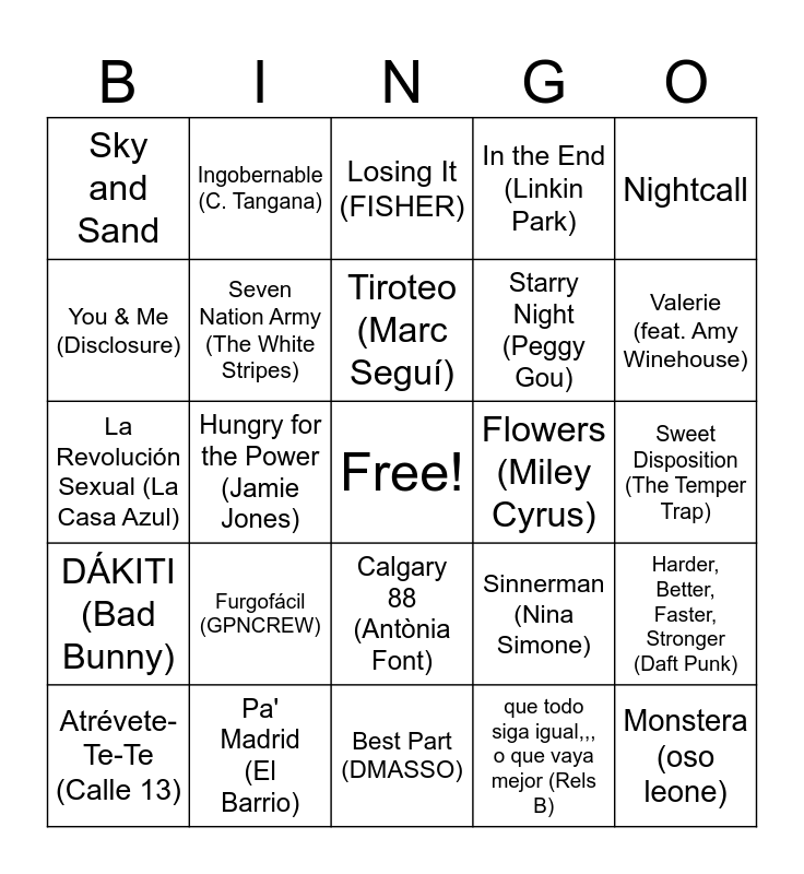 This bingo card has a free space and 68 words: Waterloo, Monstera (oso leone), Mediterraneo (Serrat), Bamboléo (Gipsy Kings), Sarandonga (Lolita), The Less I Know The Better (Tame Impala), Ingobernable (C. Tangana), La Mujer de Verde (IZAL), Tiroteo (Marc Seguí), Los Perros (Arde Bogotá), Calgary 88 (Antònia Font), Ya No Te Hago Falta (Sen Senra), Sweet Disposition (The Temper Trap), Nightcall, PLACES (The Blaze), You & Me (Disclosure), Hungry for the Power (Jamie Jones), Sky and Sand, Danza de Vision (Nicola Cruz), Furgofácil (GPNCREW), Starry Night (Peggy Gou), Sinnerman (Nina Simone), DÁKITI (Bad Bunny), Mambo Rap (Parov Stelar), Ateo (C. Tangana), DELITO (NATHY PELUSO), Let Me Blow Ya Mind (Gwen Stefani), Pursuit Of Happiness (Steve Aoki), Harder, Better, Faster, Stronger (Daft Punk), Thunderstruck (AC/DC), Losing It (FISHER), We Are The People (Empire Of The Sun), Jungle (Tash Sultana), Believer (Imagine Dragons), In the End (Linkin Park), Yellow (Coldplay), Lonely Boy (The Black Keys), Atrévete-Te-Te (Calle 13), Valerie (feat. Amy Winehouse), La Revolución Sexual (La Casa Azul), We Are Your Friends (Justice), Mr. Brightside, Seven Nation Army (The White Stripes), Take Me Out (Franz Ferdinand), Toxic (Britney Spears), Crazy In Love (Beyoncé), I Gotta Feeling (Black Eyed Peas), As It Was, Flowers (Miley Cyrus), Pa' Madrid (El Barrio), Me Colé en una Fiesta (Mecano), Ni tú ni nadie (Alaska Y Dinarama), Ready for Love (Paco Colombàs), Best Part (DMASSO), pink + pink (rusowsky, Ravyn Lenae), malibU (rusowsky), que todo siga igual,,, o que vaya mejor (Rels B), Rebota Bootleg (Bruno Borlone), Cumbia Sobre el Mar (Quantic), Gold Digger (Kanye West), Agosto (Bad Bunny), Yes Sir, I Can Boogie (The Fratellis), Chan Chan (Buena Vista Social Club), When The Sun Goes Down (Arctic Monkeys), Clint Eastwood (Gorillaz), Latinoamérica (Calle 13), Midnight City and BONGO BONG (Robbie Williams).