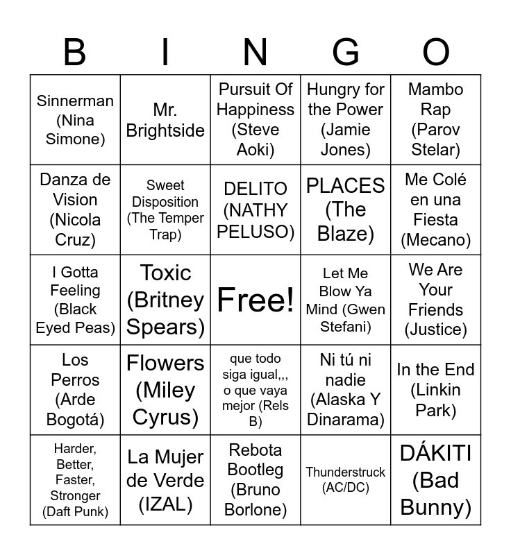 This bingo card has a free space and 62 words: Ingobernable (C. Tangana), La Mujer de Verde (IZAL), Tiroteo (Marc Seguí), Los Perros (Arde Bogotá), Calgary 88 (Antònia Font), Ya No Te Hago Falta (Sen Senra), Sweet Disposition (The Temper Trap), Nightcall, PLACES (The Blaze), You & Me (Disclosure), Hungry for the Power (Jamie Jones), Sky and Sand, Danza de Vision (Nicola Cruz), Furgofácil (GPNCREW), Starry Night (Peggy Gou), Sinnerman (Nina Simone), DÁKITI (Bad Bunny), Mambo Rap (Parov Stelar), Ateo (C. Tangana), DELITO (NATHY PELUSO), Let Me Blow Ya Mind (Gwen Stefani), Pursuit Of Happiness (Steve Aoki), Harder, Better, Faster, Stronger (Daft Punk), Thunderstruck (AC/DC), Losing It (FISHER), We Are The People (Empire Of The Sun), Jungle (Tash Sultana), Believer (Imagine Dragons), In the End (Linkin Park), Yellow (Coldplay), Lonely Boy (The Black Keys), Atrévete-Te-Te (Calle 13), Valerie (feat. Amy Winehouse), La Revolución Sexual (La Casa Azul), We Are Your Friends (Justice), Mr. Brightside, Seven Nation Army (The White Stripes), Take Me Out (Franz Ferdinand), Toxic (Britney Spears), Crazy In Love (Beyoncé), I Gotta Feeling (Black Eyed Peas), As It Was, Flowers (Miley Cyrus), Pa' Madrid (El Barrio), Me Colé en una Fiesta (Mecano), Ni tú ni nadie (Alaska Y Dinarama), Ready for Love (Paco Colombàs), Best Part (DMASSO), pink + pink (rusowsky, Ravyn Lenae), malibU (rusowsky), que todo siga igual,,, o que vaya mejor (Rels B), Rebota Bootleg (Bruno Borlone), Cumbia Sobre el Mar (Quantic), Gold Digger (Kanye West), Agosto (Bad Bunny), Yes Sir, I Can Boogie (The Fratellis), Chan Chan (Buena Vista Social Club), When The Sun Goes Down (Arctic Monkeys), Clint Eastwood (Gorillaz), Latinoamérica (Calle 13), Midnight City and BONGO BONG (Robbie Williams).