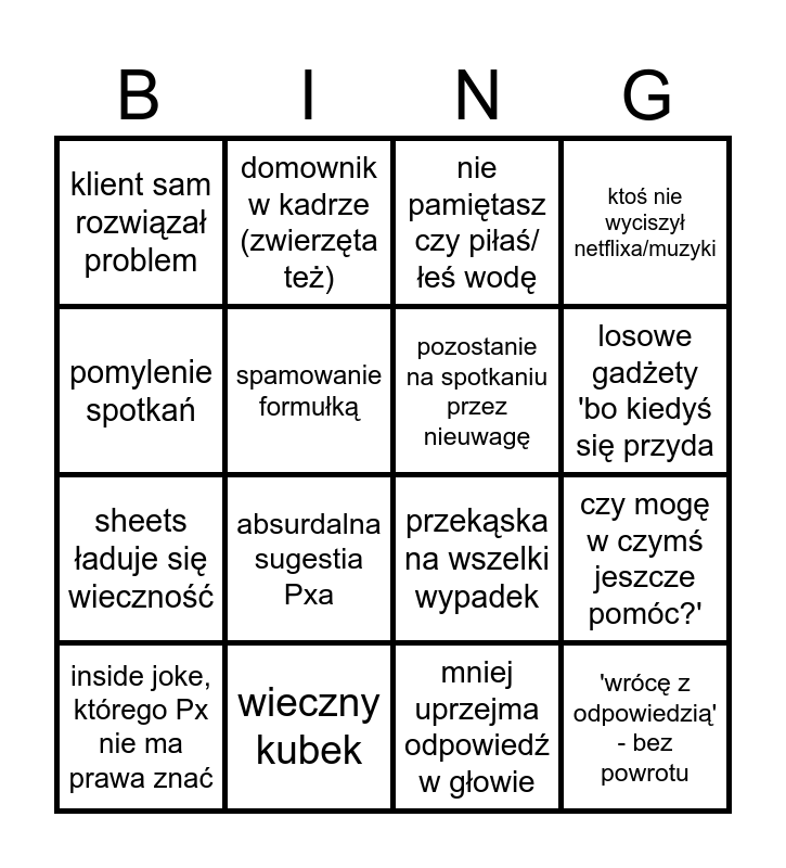 This bingo card has 16 words: wieczny kubek, czy mogę w czymś jeszcze pomóc?', nie pamiętasz czy piłaś/łeś wodę, klient sam rozwiązał problem, sheets ładuje się wieczność, domownik w kadrze (zwierzęta też), przekąska na wszelki wypadek, mniej uprzejma odpowiedź w głowie, pomylenie spotkań, spamowanie formułką, inside joke, którego Px nie ma prawa znać, ktoś nie wyciszył netflixa/muzyki, absurdalna sugestia Pxa, losowe gadżety 'bo kiedyś się przyda, pozostanie na spotkaniu przez nieuwagę and 'wrócę z odpowiedzią' - bez powrotu.
