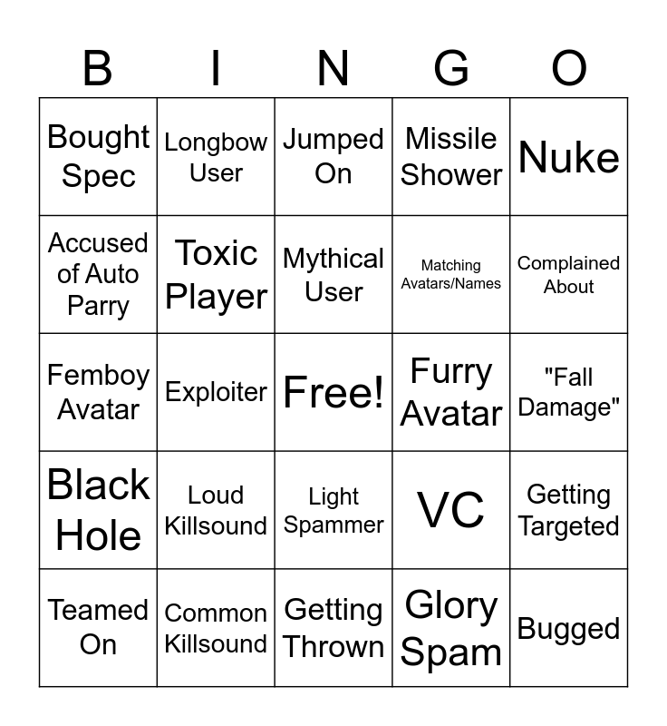 This bingo card has a free space and 24 words: Loud Killsound, Common Killsound, Mythical User, Teamed On, Nuke, Bought Spec, Accused of Auto Parry, Longbow User, Furry Avatar, Light Spammer, Matching Avatars/Names, Femboy Avatar, VC, Getting Targeted, Toxic Player, Glory Spam, "Fall Damage", Jumped On, Complained About, Exploiter, Bugged, Black Hole, Missile Shower and Getting Thrown.