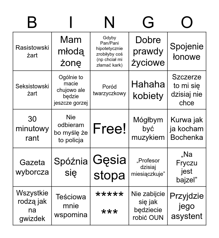 This bingo card has a free space and 24 words: Spóźnia się, Teściowa mnie wspomina, Poród twarzyczkowy, Wszystkie rodzą jak na gwizdek, Spojenie łonowe, Rasistowski żart, Seksistowski żart, Mam młodą żonę, Mógłbym być muzykiem, Gęsia stopa, Hahaha kobiety, 30 minutowy rant, „Profesor dzisiaj miesiączkuje”, „Na Fryczu jest bajzel”, Ogólnie to macie chujowo ale będzie jeszcze gorzej, Nie zabijcie się jak będziecie robić OUN, Kurwa jak ja kocham Bochenka, Gdyby Pan/Pani hipotetycznie zrobiłyby coś (np chciał mi złamać kark), Szczerze to mi się dzisiaj nie chce, Nie odbieram bo myślę że to policja, Przyjdzie jego asystent, Gazeta wyborcza, Dobre prawdy życiowe and ***** ***.