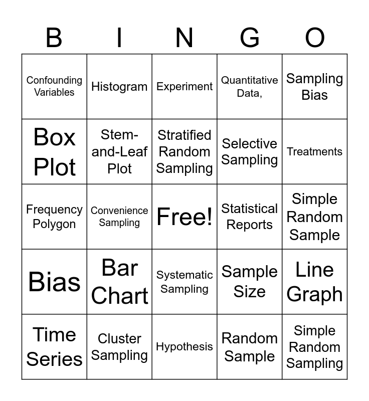 This bingo card has a free space and 26 words: Systematic Sampling, Random Sample, Stratified Random Sampling, Cluster Sampling, Sampling Bias, Confounding Variables, Box Plot, Histogram, Simple Random Sample, Sample Size, Selective Sampling, Frequency Polygon, Line Graph, Time Series, Convenience Sampling, Independent Variable, Quantitative Data,, Bias, Experiment, Simple Random Sampling, Treatments, Hypothesis, Statistical Reports, Bar Chart, Stem-and-Leaf Plot and Dependent Variable.