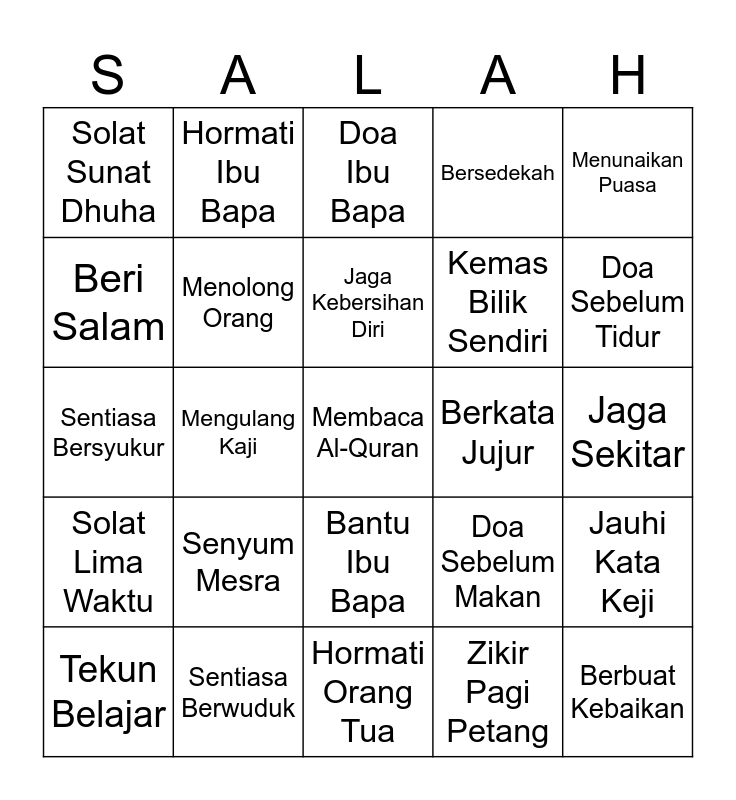 This bingo card has 25 words: Solat Lima Waktu, Sentiasa Berwuduk, Membaca Al-Quran, Zikir Pagi Petang, Menunaikan Puasa, Solat Sunat Dhuha, Hormati Ibu Bapa, Doa Ibu Bapa, Berkata Jujur, Jauhi Kata Keji, Beri Salam, Menolong Orang, Hormati Orang Tua, Doa Sebelum Makan, Doa Sebelum Tidur, Tekun Belajar, Mengulang Kaji, Jaga Kebersihan Diri, Kemas Bilik Sendiri, Jaga Sekitar, Sentiasa Bersyukur, Senyum Mesra, Bantu Ibu Bapa, Bersedekah and Berbuat Kebaikan.
