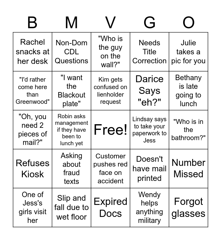This bingo card has a free space and 49 words: "Can't you use my old picture?", Forgot glasses, Insists we need divorce decree, Expired Docs, Asking about fraud texts, Needs to submit COC, Non-Dom CDL Questions, Needs Drive Record, "I'd rather come here than Greenwood", Needs written exam, "I want the Blackout plate", Needs Title Correction, Number Missed, Doesn't have mail printed, Moves camera chair, "They did it for me at another branch", Kim gets confused on lienholder request, Lindsay says to take your paperwork to Jess, Haley works in Franklin, Julie takes a pic for you, Robin asks management if they have been to lunch yet, Wendy helps anything military, Rachel snacks at her desk, Darice Says "eh?", Tabetha sings along with the radio, Bethany is late going to lunch, One of Jess's girls visit her, Someone sends a private Teams message to the group, Customer pushes red face on accident, Refuses Kiosk, "You'll have to speak up, I left my hearing aids at home", You have to tell your customer to sign their new name, Signature fail, We need and get help, Slip and fall due to wet floor, Customer on phone at your desk, Free!, Interpreter test passes with at least one 100%, "Who is in the bathroom?", "Do you have a Notary?", Have to use Pocket Talk, Customer bathroom "Out of Order", "When did your hours change?", "But I have been divorced for years", "Oh, you need 2 pieces of mail?", "Who is the guy on the wall?", "Can I speak to a manager?", Fit Thrower and Printer Poof!.