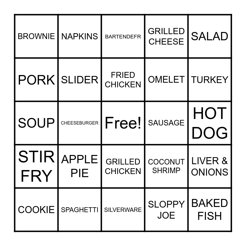 This bingo card has a free space and 75 words: CHEF, BUSSER, BARTENDEFR, HOSTESS, ROCKWELLS, RESTAURANT, COOK, SWEET POTATO, BAKED POTATO, CHEESE CURDS, CRAB CAKE, ONION STRINGS, FRIED CHICKEN, PORK, STEAK, CHEESEBURGER, SALMON, BAKED FISH, FISH FRY, SALAD, REUBEN, SOUP, SLIDER, NAPKINS, GRILLED CHEESE, HAMBURGER, BLT, GARDEN BURGER, TOP SIRLOIN, SUNDAE, CAKE, CHEESECAKE, BREADED SHRIMP, COCONUT SHRIMP, TURKEY, OMELET, HAM, CHILI DOG, HOT DOG, SLOPPY JOE, POT ROAST, TENDERLOIN, CAESAR SALAD, TUNA MELT, FRENCH TOAST, MUFFIN, COOKIE, BROWNIE, ICE CREAM, PORK CHOP, MEATBALLS, GRILLED CHICKEN, LASAGNA, PIZZA, CHIPS, FRIED RICE, EGG ROLLS, SOURDOUGH BREAD, ENGLISH MUFFIN, CHERRY TURNOVER, APPLE PIE, CHERRY PIE, FRENCH FRIES, WAFFLE, PANCAKES, SAUSAGE, BACON, RYE BREAD, WHEAT BREAD, LIVER & ONIONS, STIR FRY, SPAGHETTI, TABLE NUMBER, SILVERWARE and SERVER.
