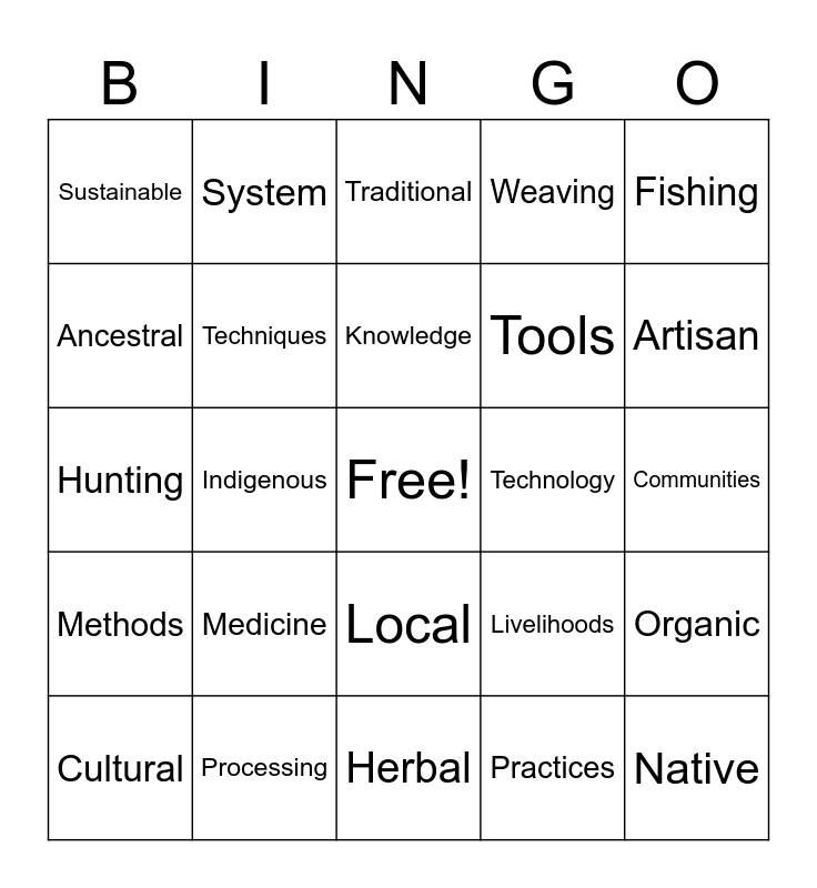 This bingo card has a free space and 24 words: Medicine, Processing, Knowledge, Cultural, Fishing, Sustainable, Ancestral, System, Technology, Local, Tools, Hunting, Livelihoods, Organic, Techniques, Practices, Communities, Traditional, Artisan, Indigenous, Native, Methods, Weaving and Herbal.