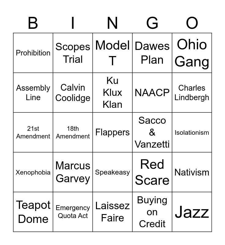 This bingo card has 25 words: Marcus Garvey, Laissez Faire, Ku Klux Klan, Teapot Dome, Ohio Gang, Prohibition, Assembly Line, Scopes Trial, Sacco & Vanzetti, Speakeasy, NAACP, 21st Amendment, Red Scare, Nativism, Calvin Coolidge, Jazz, Isolationism, Model T, Charles Lindbergh, 18th Amendment, Flappers, Emergency Quota Act, Xenophobia, Dawes Plan and Buying on Credit.