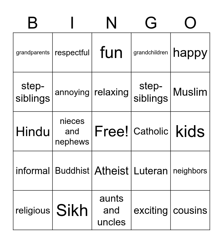 This bingo card has a free space and 34 words: What is it like?, exciting, loud, formal, informal, annoying, happy, religious, respectful, unforgettable, relaxing, fun, Christian, Jewish, Catholic, Muslim, Sikh, Hindu, Buddhist, Luteran, Atheist, parents, grandparents, kids, aunts and uncles, cousins, grandchildren, siblings, step-siblings, step-siblings, step-parents, nieces and nephews, neighbors and family friends.