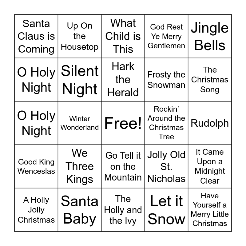 This bingo card has a free space and 41 words: Blue Christmas, O Holy Night, O Come All Ye Faithful, Silent Night, Santa Baby, Go Tell it on the Mountain, Hark the Herald, I’ll Be Home for Christmas, Jingle Bells, Good King Wenceslas, Winter Wonderland, God Rest Ye Merry Gentlemen, Have Yourself a Merry Little Christmas, Rudolph, Rockin’ Around the Christmas Tree, We Three Kings, O Little Town of Bethlehem, Santa Claus is Coming, Feliz Navidad, What Child is This, It Came Upon a Midnight Clear, Auld Lang Syne, The Holly and the Ivy, Frosty the Snowman, The First Noel, Joy to the World, Let it Snow, O Christmas Tree, The Christmas Song, Deck the Halls, We Wish You a Merry Christmas, Up On the Housetop, A Holly Jolly Christmas, Jingle Bell Rock, Jolly Old St. Nicholas, O Holy Night, Angels We Have Heard, White Christmas, Away in a Manger, Here Comes Santa Claus and Little Drummer Boy.
