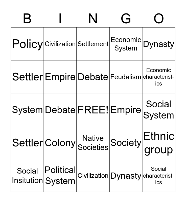 This bingo card has a free space and 24 words: Colony, Political System, Debate, Social Insitution, Dynasty, Policy, Settler, Civilization, Empire, Native Societies, Feudalism, System, Society, Ethnic group, Empire, Dynasty, Social System, Settlement, Economic characterist-ics, Debate, Social characterist-ics, Settler, Economic System and Civilization.