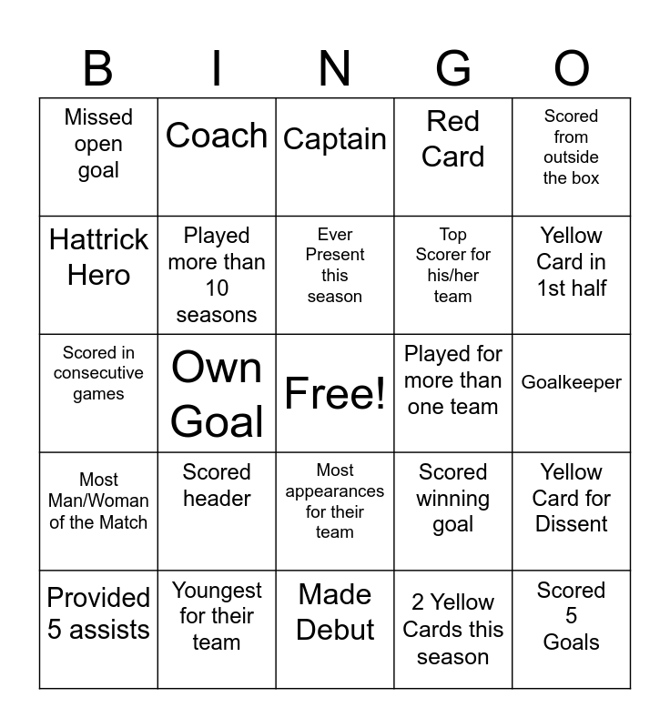 This bingo card has a free space and 24 words: Scored header, Youngest for their team, Ever Present this season, Provided 5 assists, Scored from outside the box, Missed open goal, Hattrick Hero, Coach, Played for more than one team, Most appearances for their team, Top Scorer for his/her team, Scored in consecutive games, Scored winning goal, Yellow Card for Dissent, Played more than 10 seasons, 2 Yellow Cards this season, Goalkeeper, Captain, Yellow Card in 1st half, Own Goal, Scored 5 Goals, Most Man/Woman of the Match, Red Card and Made Debut.