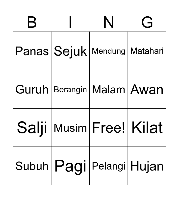 This bingo card has 19 words: Free!, Cuaca, Mendung, Hujan, Kilat, Guruh, Pelangi, Panas, Sejuk, Salji, Musim, Berangin, Malam, Pagi, Subuh, Senja, Matahari, Awan and Ribut.