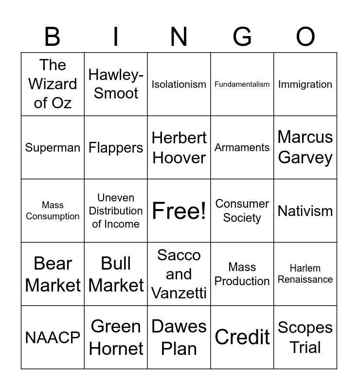 This bingo card has a free space and 24 words: Bull Market, Green Hornet, Herbert Hoover, NAACP, Immigration, The Wizard of Oz, Superman, Hawley-Smoot, Consumer Society, Sacco and Vanzetti, Armaments, Mass Consumption, Mass Production, Harlem Renaissance, Flappers, Credit, Nativism, Isolationism, Marcus Garvey, Uneven Distribution of Income, Scopes Trial, Bear Market, Fundamentalism and Dawes Plan.