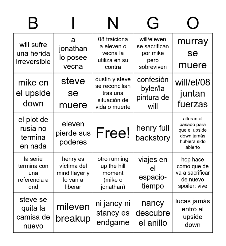 This bingo card has a free space and 24 words: henry es víctima del mind flayer y lo van a liberar, mileven breakup, dustin y steve se reconcilian tras una situación de vida o muerte, steve se quita la camisa de nuevo, murray se muere, will sufre una herida irreversible, mike en el upside down, a jonathan lo posee vecna, henry full backstory, otro running up the hill moment (mike o jonathan), confesión byler/la pintura de will, el plot de rusia no termina en nada, viajes en el espacio-tiempo, hop hace como que de va a sacrificar de nuevo spoiler: vive, steve se muere, nancy descubre el anillo, alteran el pasado para que el upside down jamás hubiera sido abierto, 08 traiciona a eleven o vecna la utiliza en su contra, will/el/08 juntan fuerzas, eleven pierde sus poderes, lucas jamás entró al upside down, la serie termina con una referencia a dnd, will/eleven se sacrifican por mike pero sobreviven and ni jancy ni stancy es endgame.