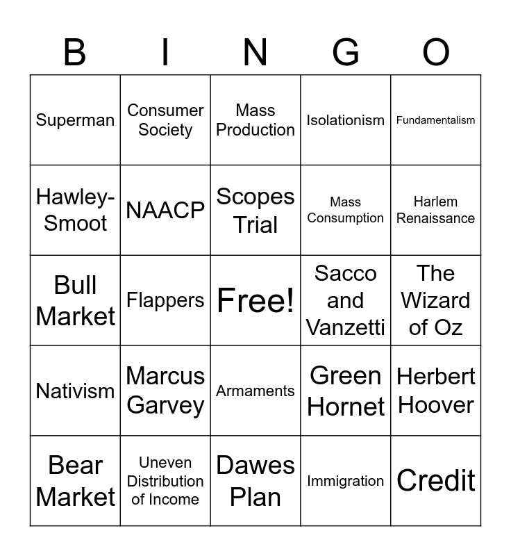This bingo card has a free space and 24 words: Marcus Garvey, Uneven Distribution of Income, Scopes Trial, Bear Market, Fundamentalism, Superman, Hawley-Smoot, Consumer Society, Sacco and Vanzetti, Armaments, Mass Consumption, Bull Market, Green Hornet, Herbert Hoover, NAACP, Immigration, The Wizard of Oz, Mass Production, Harlem Renaissance, Flappers, Credit, Nativism, Isolationism and Dawes Plan.
