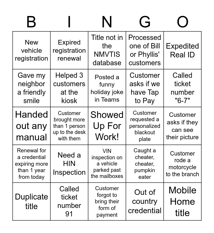 This bingo card has a free space and 24 words: Need a HIN Inspection, Called ticket number 91, Posted a funny holiday joke in Teams, Duplicate title, Expedited Real ID, New vehicle registration, Gave my neighbor a friendly smile, Expired registration renewal, Customer requested a personalized blackout plate, VIN inspection on a vehicle parked past the mailboxes, Customer asks if we have Tap to Pay, Handed out any manual, Caught a cheater, cheater, pumpkin eater, Customer rode a motorcycle to the branch, Helped 3 customers at the kiosk, Out of country credential, Customer asks if they can see their picture, Title not in the NMVTIS database, Called ticket number "6-7", Customer brought more than 1 person up to the desk with them, Mobile Home title, Renewal for a credential expiring more than 1 year from today, Processed one of Bill or Phyllis' customers and Customer forgot to bring their form of payment.