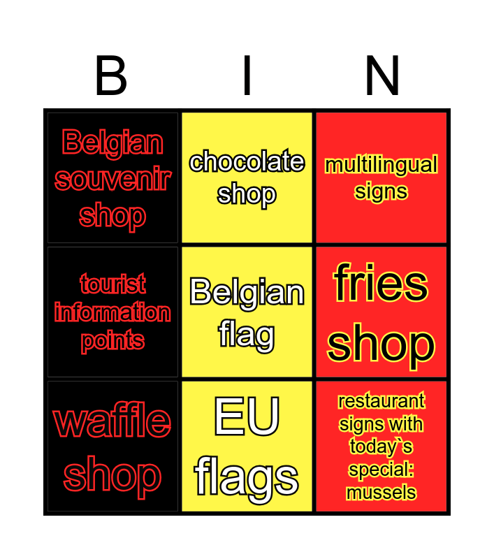 This bingo card has 9 words: waffle shop, Belgian flag, multilingual signs, Belgian souvenir shop, chocolate shop, fries shop, tourist information points, EU flags and restaurant signs with today`s special: mussels.