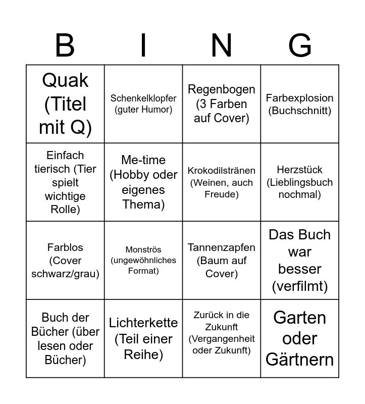 This bingo card has 16 words: Lichterkette (Teil einer Reihe), Das Buch war besser (verfilmt), Regenbogen (3 Farben auf Cover), Quak (Titel mit Q), Farblos (Cover schwarz/grau), Schenkelklopfer (guter Humor), Tannenzapfen (Baum auf Cover), Zurück in die Zukunft (Vergangenheit oder Zukunft), Einfach tierisch (Tier spielt wichtige Rolle), Me-time (Hobby oder eigenes Thema), Buch der Bücher (über lesen oder Bücher), Farbexplosion (Buchschnitt), Monströs (ungewöhnliches Format), Herzstück (Lieblingsbuch nochmal), Krokodilstränen (Weinen, auch Freude) and Garten oder Gärtnern.