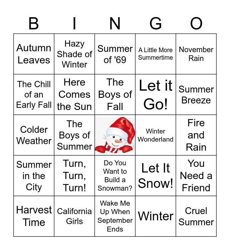 This bingo card has a free space and 25 words: Turn, Turn, Turn!, Wake Me Up When September Ends, The Boys of Fall, Harvest Time, November Rain, Autumn Leaves, The Chill of an Early Fall, Hazy Shade of Winter, Winter Wonderland, Do You Want to Build a Snowman?, Let it Go!, Colder Weather, Let It Snow!, You Need a Friend, Here Comes the Sun, Seasons in the Sun, Fire and Rain, Summer of '69, Summer Breeze, The Boys of Summer, Cruel Summer, California Girls, Summer in the City, A Little More Summertime and Winter.