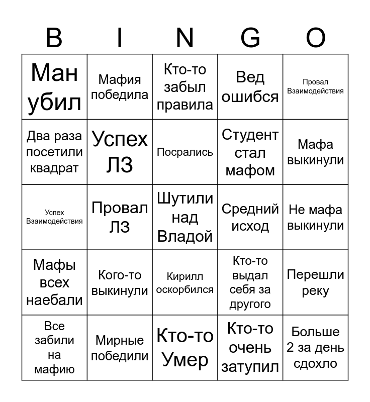 This bingo card has 25 words: Кого-то выкинули, Кто-то Умер, Посрались, Все забили на мафию, Провал Взаимодействия, Ман убил, Два раза посетили квадрат, Мафия победила, Средний исход, Кирилл оскорбился, Студент стал мафом, Успех Взаимодействия, Кто-то выдал себя за другого, Перешли реку, Успех ЛЗ, Больше 2 за день сдохло, Не мафа выкинули, Кто-то забыл правила, Мафа выкинули, Провал ЛЗ, Шутили над Владой, Мирные победили, Мафы всех наебали, Вед ошибся and Кто-то очень затупил.