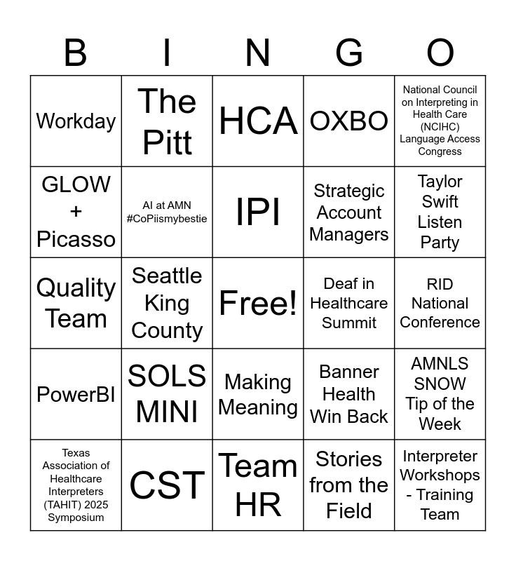 This bingo card has a free space and 31 words: Team HR, SOLS, Seattle King County, Account Ops, Workday, HCA, AI at AMN #CoPiismybestie, Banner Health Win Back, Deaf in Healthcare Summit, Stories from the Field, RID National Conference, Interpreter Workshops - Training Team, Lunch & Learn, Atrium Health Language Access Summit, Taylor Swift Listen Party, WFM, AMNLS SNOW Tip of the Week, SOLS MINI, PowerBI, Making Meaning, National Council on Interpreting in Health Care (NCIHC) Language Access Congress, Interpreter Appreciation Day, Texas Association of Healthcare Interpreters (TAHIT) 2025 Symposium, The Pitt, Strategic Account Managers, GLOW + Picasso, OXBO, Quality Team, CST, IPI and OPI.