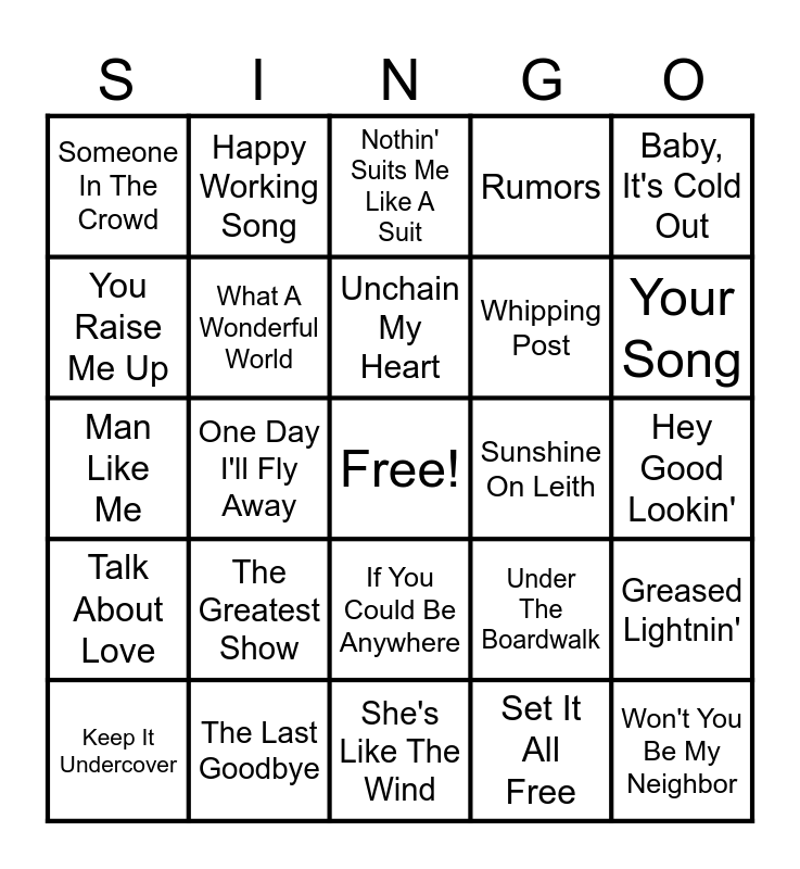 This bingo card has a free space and 42 words: Main Attraction, Unchain My Heart, What If, The Greatest Show, Set It All Free, Greased Lightnin', Won't You Be My Neighbor, I Dreamed A Dream, Nothin' Suits Me Like A Suit, If You Could Be Anywhere, Hey Good Lookin', Your Song, One Day I'll Fly Away, Baby, It's Cold Out, Party All The TIme, Under The Boardwalk, Get Back Up Again, Man Like Me, Hit Me With Your Best Shot, Happy Working Song, You Raise Me Up, The Place Where Lost Things Go, Belle, Someone In The Crowd, Bringin' Back Christmas, I'm Just Ken, Whipping Post, Walk on Water, Santa Fa, Fly Love, Rewrite The Stars, Talk About Love, What A Wonderful World, She's Like The Wind, Same Old Love, Keep It Undercover, The Last Goodbye, Sunshine On Leith, Here It Is Christmas Time, I'm Still Standing, Rumors and The Hanging Tree.