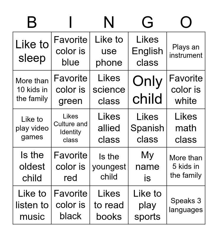 This bingo card has 25 words: Favorite color is red, Likes to read books, Likes science class, Like to listen to music, Plays an instrument, Like to sleep, More than 10 kids in the family, Favorite color is blue, Likes Spanish class, Is the youngest child, Only child, Like to play video games, My name is, More than 5 kids in the family, Favorite color is green, Speaks 3 languages, Likes math class, Like to use phone, Favorite color is white, Likes Culture and Identity class, Likes allied class, Favorite color is black, Is the oldest child, Likes English class and Like to play sports.