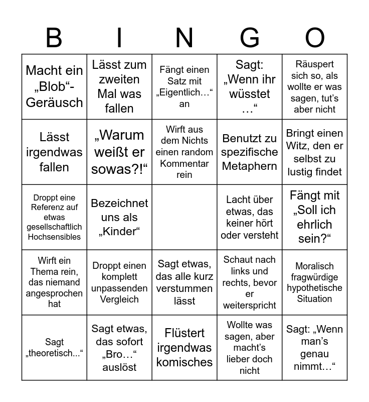 This bingo card has a free space and 24 words: Droppt einen komplett unpassenden Vergleich, Sagt etwas, das sofort „Bro…“ auslöst, Wirft aus dem Nichts einen random Kommentar rein, Sagt „theoretisch...“, Räuspert sich so, als wollte er was sagen, tut’s aber nicht, Macht ein „Blob“-Geräusch, Lässt irgendwas fallen, Lässt zum zweiten Mal was fallen, Lacht über etwas, das keiner hört oder versteht, Sagt etwas, das alle kurz verstummen lässt, Benutzt zu spezifische Metaphern, Droppt eine Referenz auf etwas gesellschaftlich Hochsensibles, Schaut nach links und rechts, bevor er weiterspricht, Moralisch fragwürdige hypothetische Situation, „Warum weißt er sowas?!“, Wollte was sagen, aber macht’s lieber doch nicht, Fängt mit „Soll ich ehrlich sein?“, Fängt einen Satz mit „Eigentlich…“ an, Bringt einen Witz, den er selbst zu lustig findet, Bezeichnet uns als „Kinder“, Sagt: „Wenn man’s genau nimmt…“, Wirft ein Thema rein, das niemand angesprochen hat, Sagt: „Wenn ihr wüsstet …“ and Flüstert irgendwas komisches.