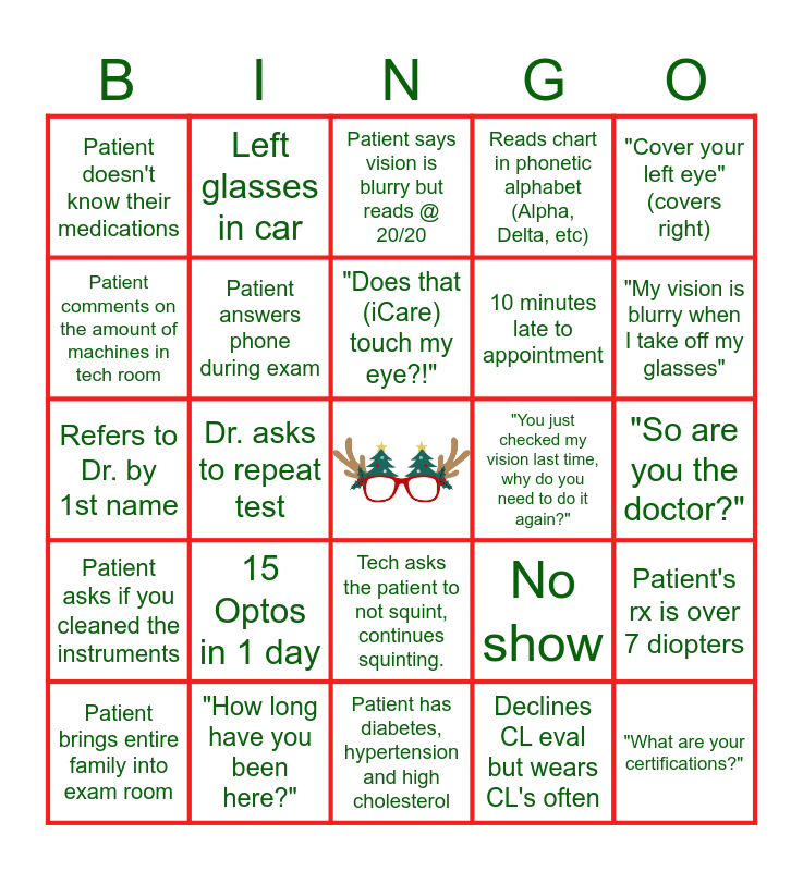 This bingo card has a free space and 24 words: 15 Optos in 1 day, "How long have you been here?", "Does that (iCare) touch my eye?!", Patient brings entire family into exam room, "Cover your left eye" (covers right), Patient doesn't know their medications, Patient comments on the amount of machines in tech room, Left glasses in car, "You just checked my vision last time, why do you need to do it again?", Tech asks the patient to not squint, continues squinting., 10 minutes late to appointment, Refers to Dr. by 1st name, No show, Patient's rx is over 7 diopters, Patient answers phone during exam, Declines CL eval but wears CL's often, "So are you the doctor?", Patient says vision is blurry but reads @ 20/20, "My vision is blurry when I take off my glasses", Dr. asks to repeat test, "What are your certifications?", Patient asks if you cleaned the instruments, Reads chart in phonetic alphabet (Alpha, Delta, etc) and Patient has diabetes, hypertension and high cholesterol.