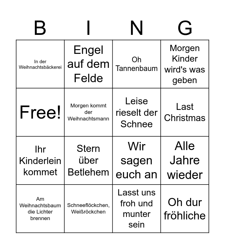 This bingo card has 16 words: Schneeflöckchen, Weißröckchen, Alle Jahre wieder, Oh Tannenbaum, In der Weihnachtsbäckerei, Ihr Kinderlein kommet, Engel auf dem Felde, Wir sagen euch an, Lasst uns froh und munter sein, Free!, Morgen kommt der Weihnachtsmann, Am Weihnachtsbaum die Lichter brennen, Morgen Kinder wird's was geben, Stern über Betlehem, Last Christmas, Leise rieselt der Schnee and Oh dur fröhliche.