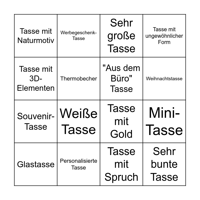 This bingo card has 31 words: Free!, Tasse mit Retro-Design, Mini-Tasse, Tasse von Oma, Tasse mit Naturmotiv, Sehr große Tasse, "Aus dem Büro" Tasse, Tasse mit Motivationsspruch, Personalisierte Tasse, Städtetasse, Tasse mit Spruch, Glastasse, Tasse ohne Henkel, Metalltasse, Weiße Tasse, Einfarbige Tasse, Ländertasse, Tasse mit Comicfigur, Sehr bunte Tasse, Stark abgenutzte Tasse, Tasse mit 3D-Elementen, Tasse mit Fotodruck, Tasse mit Tiermotiv, Werbegeschenk-Tasse, Souvenir-Tasse, Thermobecher, Tasse mit ungewöhnlicher Form, Tasse mit Gold, Selbstgestaltete Tasse, Weihnachtstasse and Schwarze Tasse.
