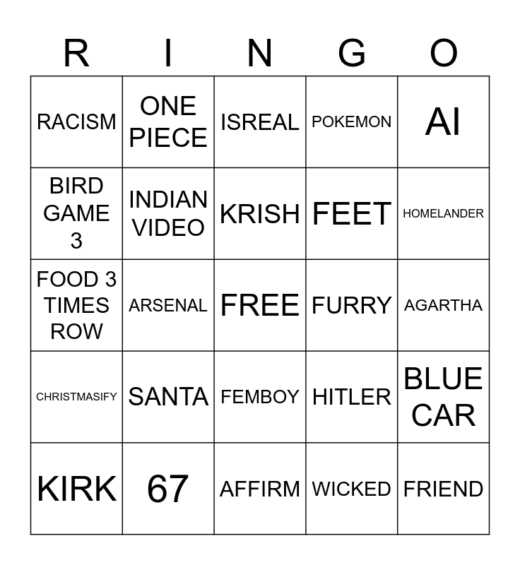 This bingo card has a free space and 24 words: SANTA, 67, KRISH, KIRK, AI, RACISM, BIRD GAME 3, ONE PIECE, FURRY, FEMBOY, FEET, FOOD 3 TIMES ROW, HITLER, BLUE CAR, INDIAN VIDEO, WICKED, AGARTHA, ISREAL, HOMELANDER, ARSENAL, FRIEND, CHRISTMASIFY, POKEMON and AFFIRM.
