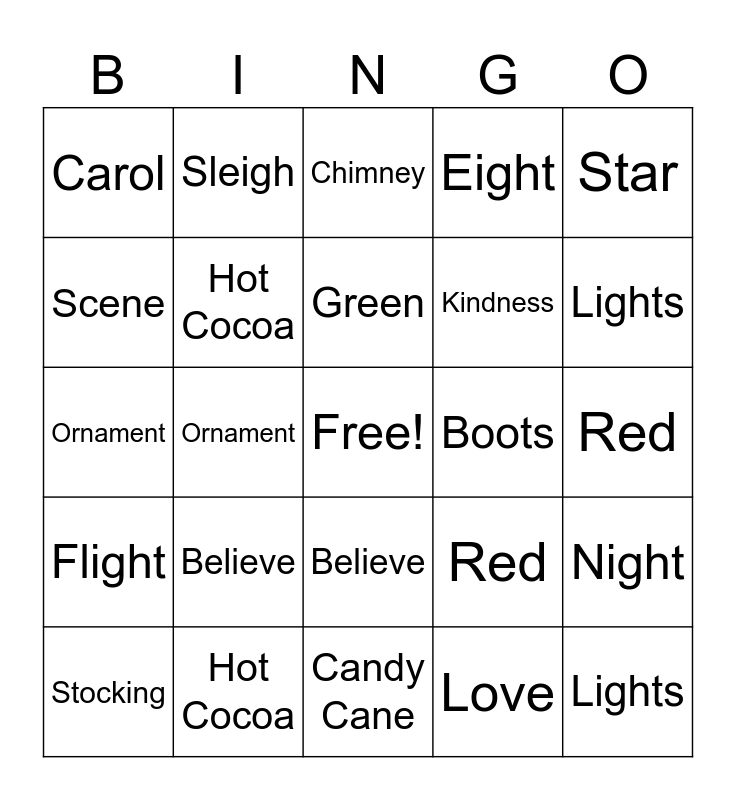 This bingo card has a free space and 48 words: Tree, Lights, Stocking, Candy Cane, Believe, Flight, Sleigh, Snow, Scene, Gold, Hot Cocoa, Eight, Night, Red, Gift, Santa, Green, Boots, Chimney, Star, Ornament, Love, Carol, Kindness, Tree, Lights, Stocking, Candy Cane, Believe, Flight, Sleigh, Snow, Scene, Gold, Hot Cocoa, Eight, Night, Red, Gift, Santa, Green, Boots, Chimney, Star, Ornament, Love, Carol and Kindness.
