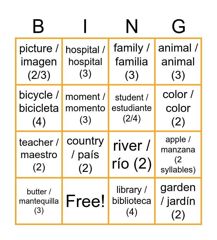 This bingo card has 16 words: Free!, apple / manzana (2 syllables), family / familia (3), picture / imagen (2/3), teacher / maestro (2), hospital / hospital (3), river / río (2), library / biblioteca (4), bicycle / bicicleta (4), moment / momento (3), butter / mantequilla (3), animal / animal (3), country / país (2), color / color (2), student / estudiante (2/4) and garden / jardín (2).