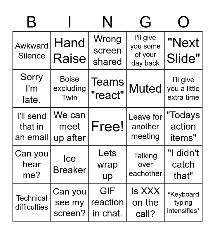 This bingo card has a free space and 24 words: Ice Breaker, Can you see my screen?, Teams "react", Technical difficulties, "Next Slide", Awkward Silence, Sorry I'm late., Hand Raise, Leave for another meeting, Lets wrap up, Muted, I'll send that in an email, Talking over eachother, "I didn't catch that", Boise excluding Twin, Is XXX on the call?, "Todays action items", Wrong screen shared, I'll give you a little extra time, We can meet up after, *Keyboard typing intensifies*, Can you hear me?, I'll give you some of your day back and GIF reaction in chat..
