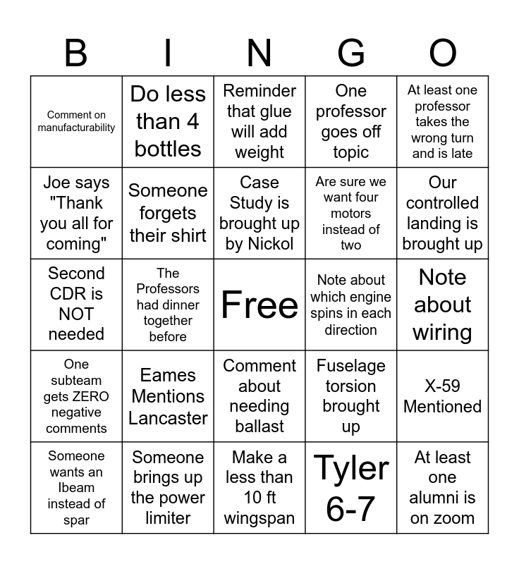 This bingo card has a free space and 24 words: Eames Mentions Lancaster, Someone brings up the power limiter, Case Study is brought up by Nickol, Someone wants an Ibeam instead of spar, At least one professor takes the wrong turn and is late, Comment on manufacturability, Joe says "Thank you all for coming", Do less than 4 bottles, Note about which engine spins in each direction, Comment about needing ballast, Are sure we want four motors instead of two, Second CDR is NOT needed, Fuselage torsion brought up, X-59 Mentioned, Someone forgets their shirt, Tyler 6-7, Note about wiring, Reminder that glue will add weight, Our controlled landing is brought up, The Professors had dinner together before, At least one alumni is on zoom, One subteam gets ZERO negative comments, One professor goes off topic and Make a less than 10 ft wingspan.